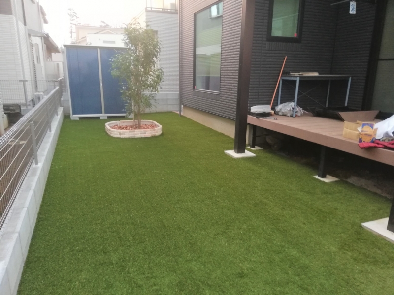 埼玉県の新築のご自宅、雑草対策の人工芝だけでなく、もっとオシャレにしたいとのご要望がありました。