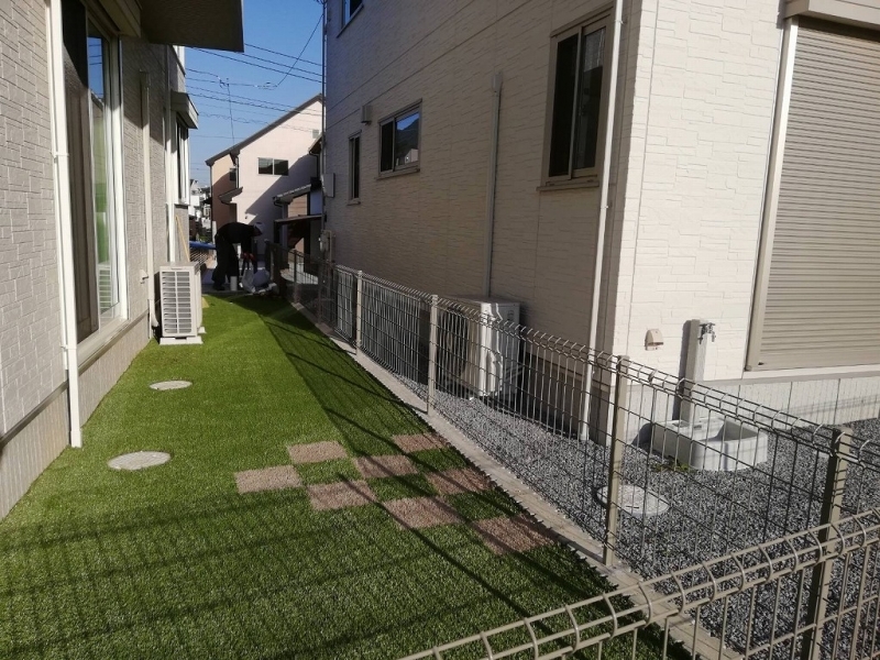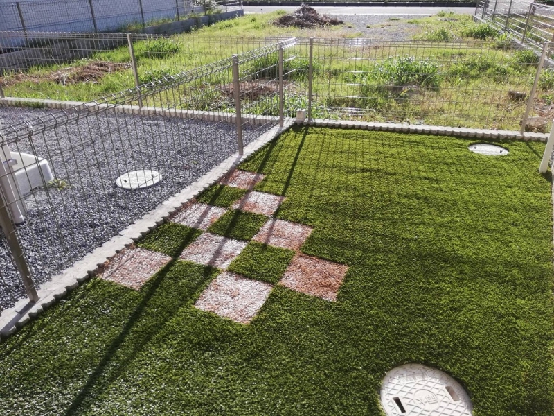今回はお客様のご要望が「雑草対策」だけでなく「子供が遊び回れる品質」「ガーデニングスペースも確保したい」「カラー人工芝で可愛くしたい」という様々なご要望がありましたが、ご紹介で期待いただいておりますので最高の品質になるまで時間をかけてお庭に人工芝工事させて頂きました。