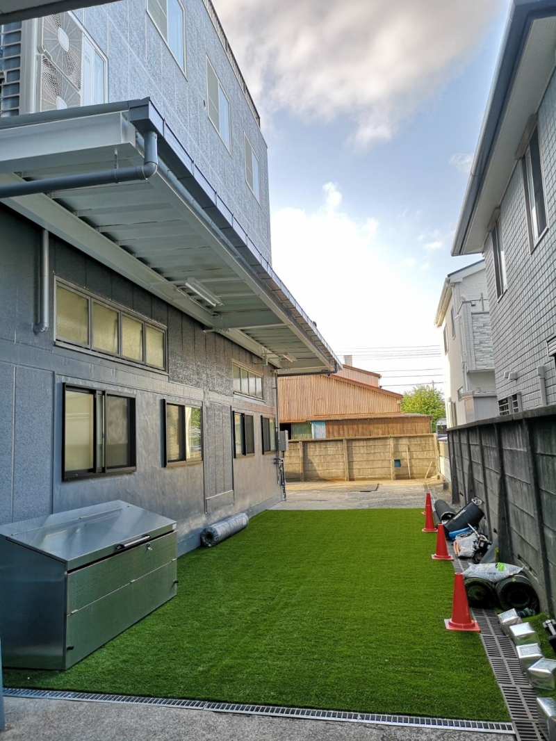 法人様からコンクリート部分への人工芝生工事ご依頼を頂きました。 コンクリート部分が欠けたり裂けている箇所もあったので、補修材を入れて直してから人工芝生を貼っていきました。 特にコンクリート面の場合には、下地の勾配や状況が仕上がりにそのまま影響しますので、 しっかり確認が必要です。 ベランダなどの防水加工面にも人工芝工事は可能ですので是非ご希望の方は無料訪問見積もりをご利用くださいませ。