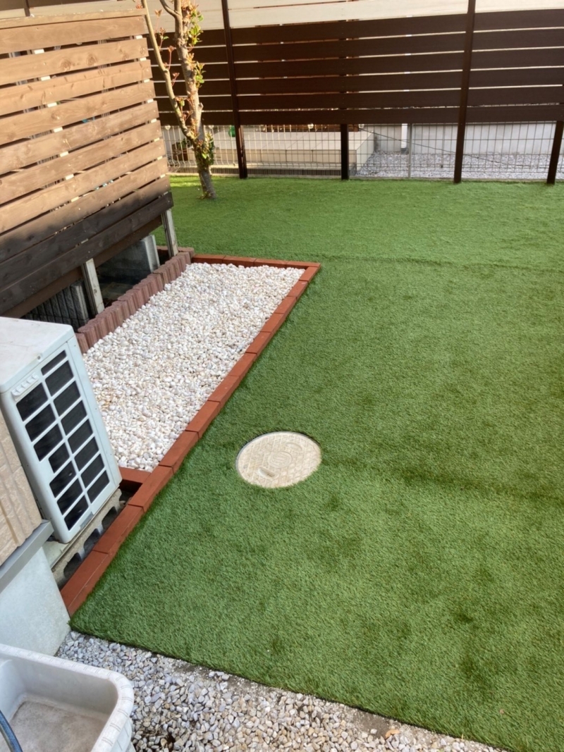 今回、既存レンガを撤去し、レンガ工事と人工芝工事をご依頼いただきました。 レンガ工事は今回のように目地なしで承ることが多いですが、目地あり工事も可能です。 (料金が変わってきます) レンガなどの外枠をきっちり直してから人工芝工事をすると、よりきれいに工事ができます。人工芝工事と同じタイミングで外構工事をご検討されている方は是非外構工事を先に完了させてから人工芝工事の流れをオススメ致します。 また、砂利部分はペットのおトイレも踏まえて設計しました。 人工芝と砂利をうまく使い分けてより快適な空間になったと喜んでいただきました。