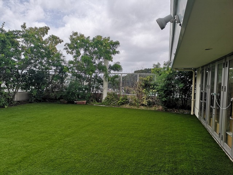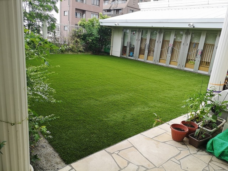 幼稚園の堰堤を工事させていただきました。 上層階の土の園庭でも工事可能でございます。 天然芝にしても園児が走り回り枯れてしまう園庭は多いようです。 人工芝でメンテナンスフリーの庭にしてみてはいかがでしょうか。