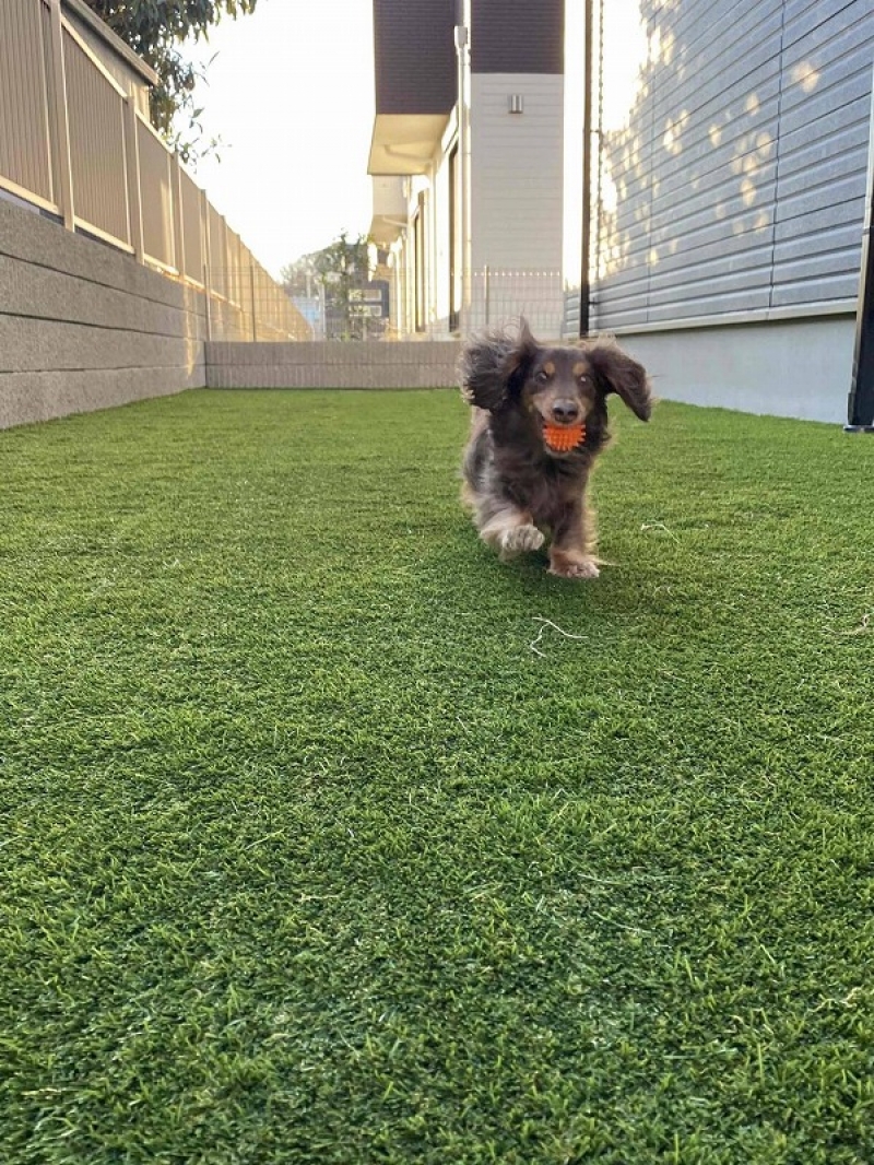 人気の肉球ワンポイントカラー人工芝も工事させていただきました☆ 肉球の位置は好きな位置を指定いただけます。 どこにワンポイントを入れるか悩むのも楽しい時間です。 ご注文有難うございました☆