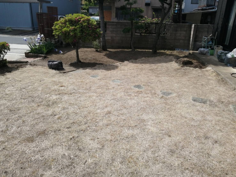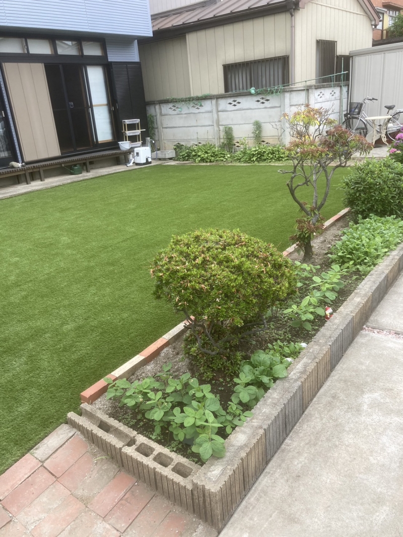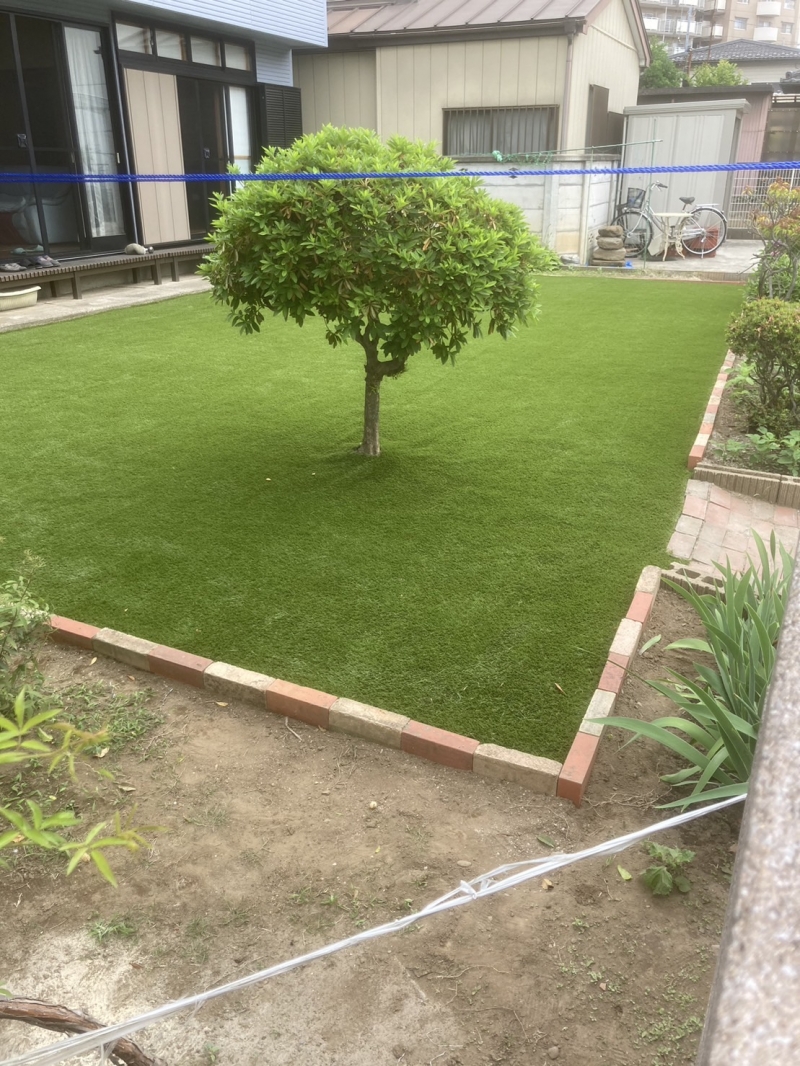 今回は雑草対策として人工芝をご依頼いただきました。 元々は天然芝、お広いと管理が難しく、、、 人工芝の範囲をレンガで区切って工事しました。