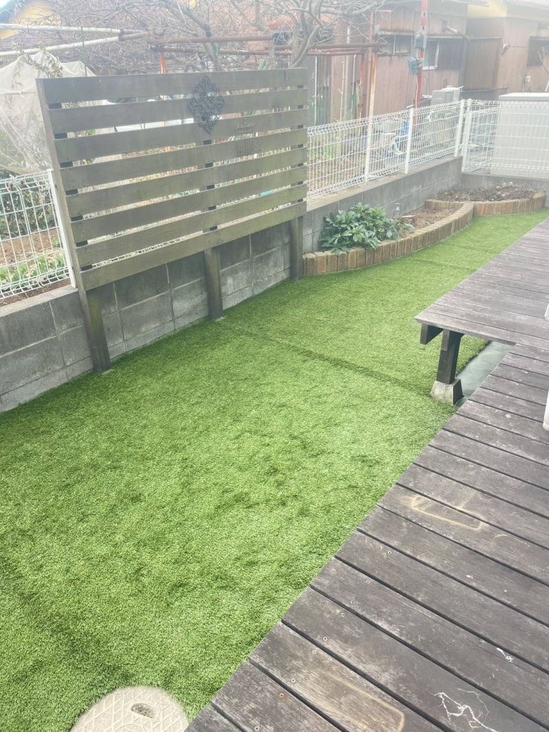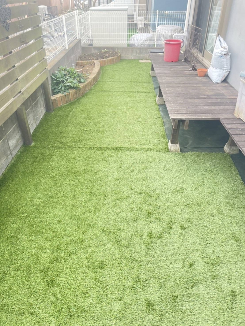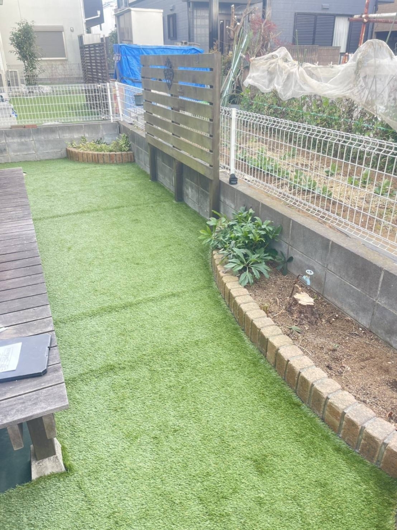 元々ありました花壇部分も、人工芝敷設したことにより よりすっきり綺麗に見えるようになりました^^ この花壇に、どんな綺麗な花が咲くか楽しみですね☆ 今後ともよろしくお願いいたします!