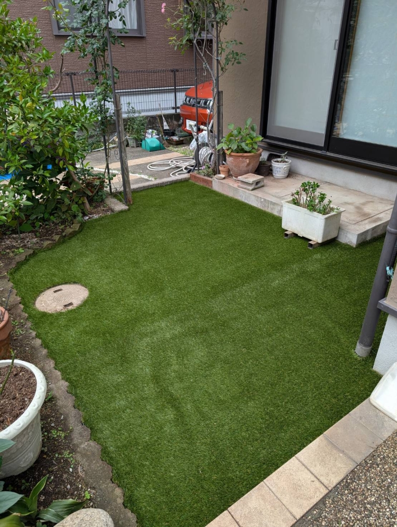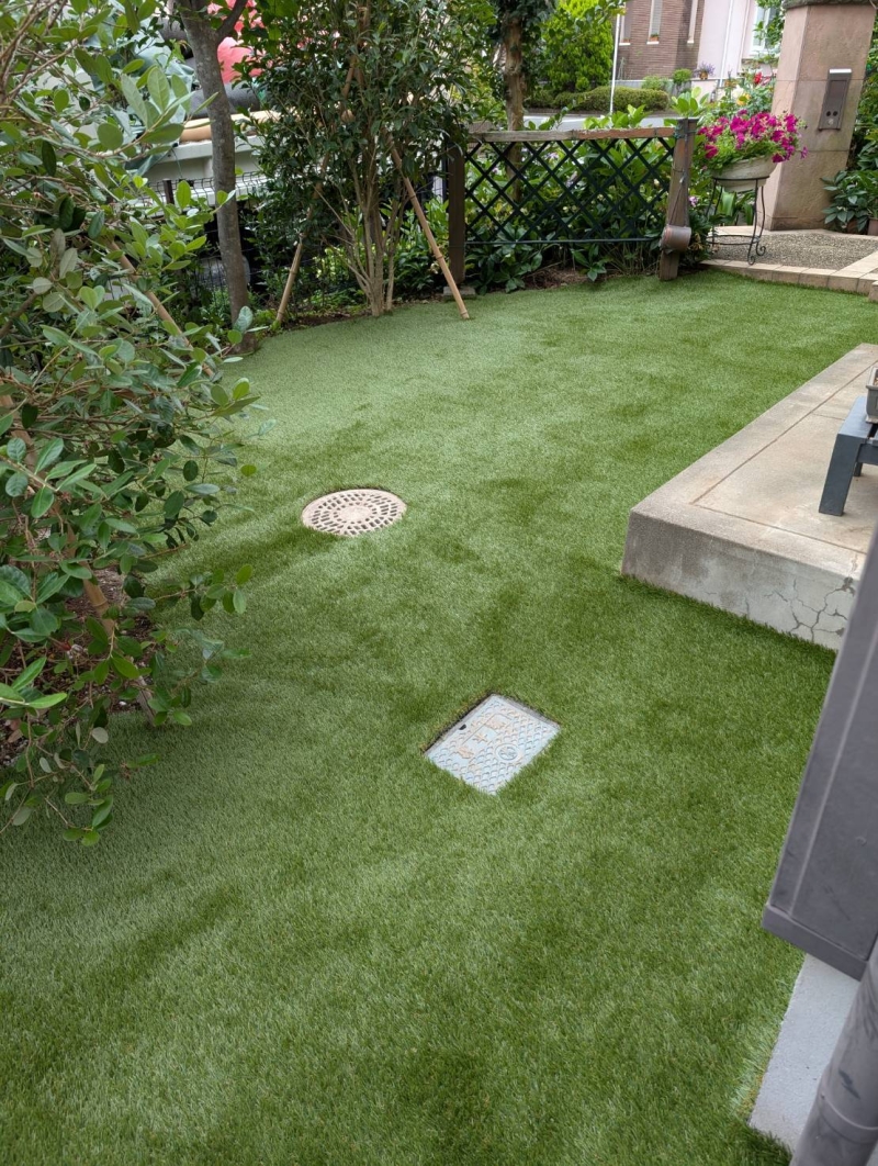 横浜市にて、人工芝工事を行いました。 砂と土の状態でお引渡しされていた 48.22㎡のお庭に、30㎜人...