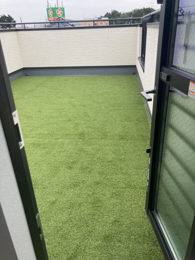 本日、練馬区にあります個人邸の屋上3階20.81平米に ハイグレード人工芝(遮熱)工事を行いました! 屋上に人工芝を設置することで、、、 コンクリートの屋上を人工芝で覆うことで、 無機質な印象から一気に自然の温かみがでます^^