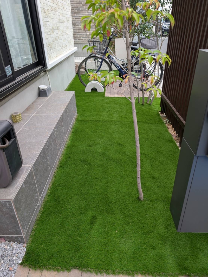 昨日、川口市の人工芝工事に行ってきました! 今回は、玄関前の天然芝部分と駐輪場の部分を人工芝工事行いました^^ 芝にしたことにより、コントラストがはっきりして より素敵なお庭になりましたね☆彡