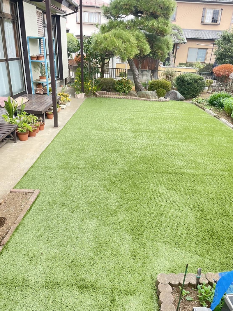 今回は、土のお庭に30mm人工芝(26.4㎡)を施工しました。 施工のポイントは、見切材(ストレート7.2...