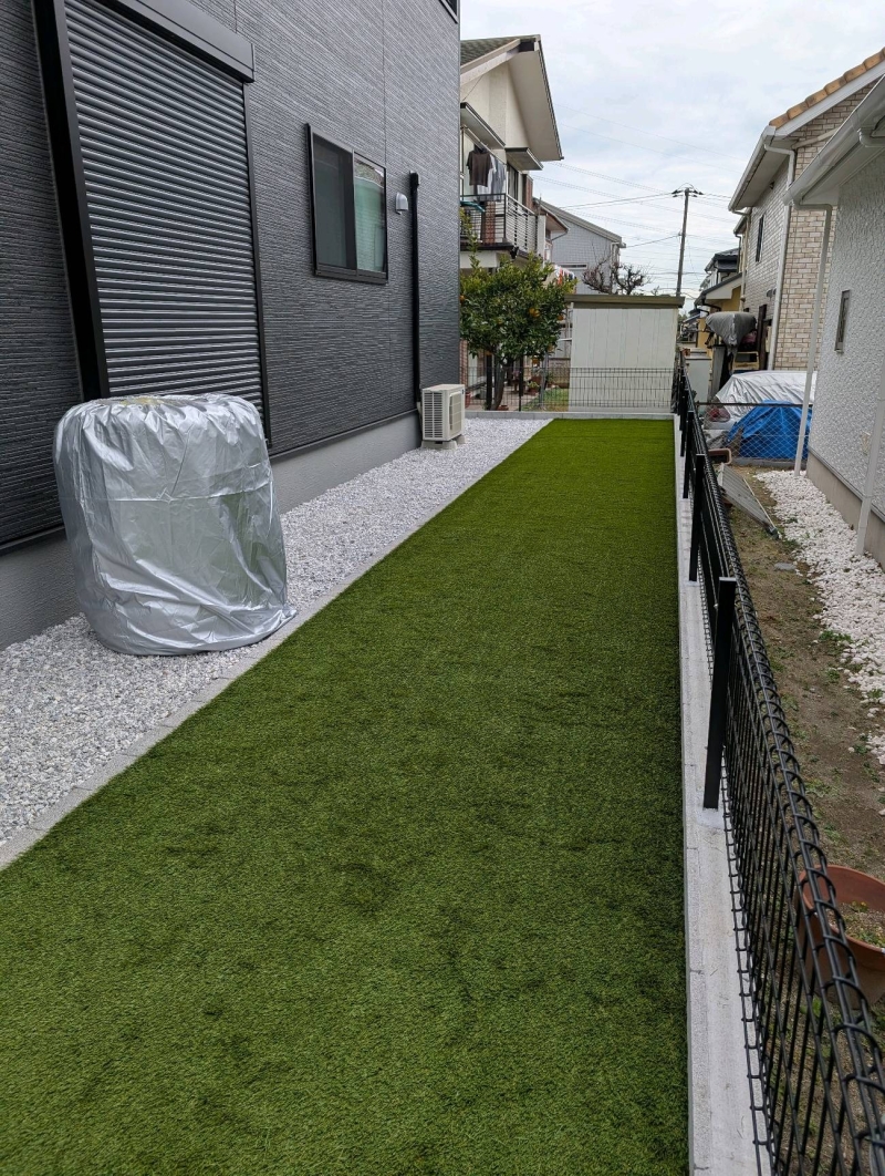 今回は、横浜市のお庭(19.5㎡)に、30mm人工芝施工を行いました。 建物横の細長いスペースを有効活用し、雑草対策と見た目の美しさを両立。 30mm芝の自然な質感と適度なクッション性により、日常的に使いやすい快適なお庭に仕上がりました。 この度はご依頼いただき、誠にありがとうございました。