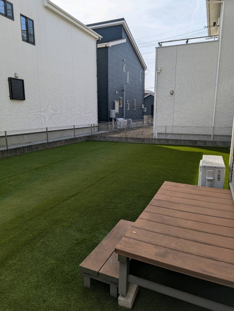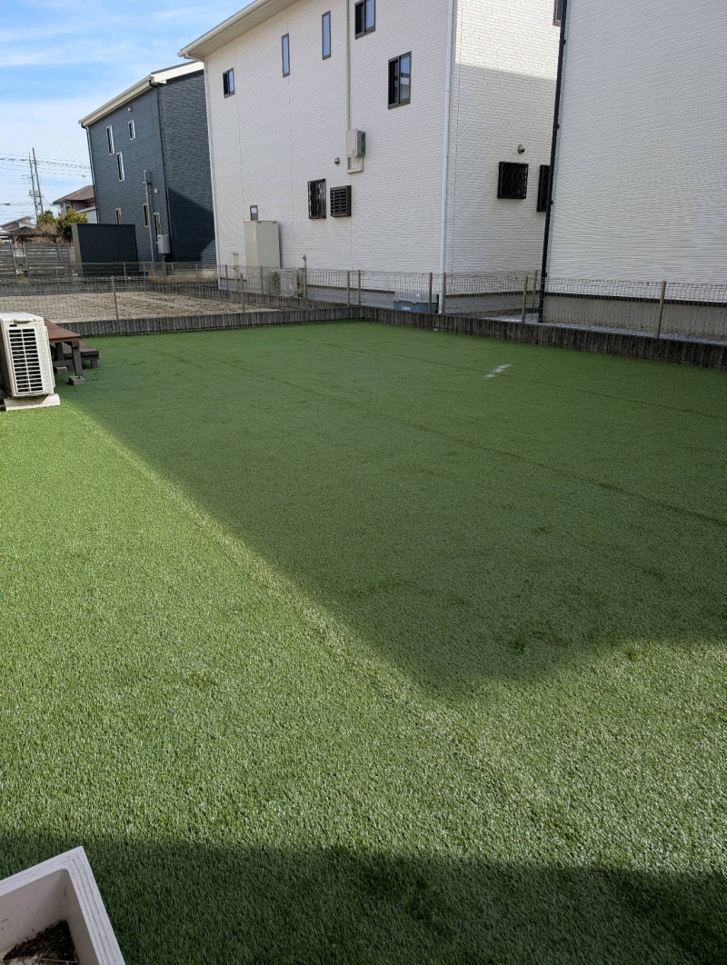 今回は、羽生市のお庭にて人工芝施工を行いました。 約78.2㎡のお庭を、30㎜タイプの人工芝で施工いたしました。 既存のウッドデッキはそのまま活かし、お庭部分を整備しております。 もともと防草シートは敷かれていましたが、その上に山砂が覆いかぶさり、端部から雑草が侵入して繁殖している状態でした。また、砂の上にも雑草が生えてしまい、管理が大変なお庭となっていました。