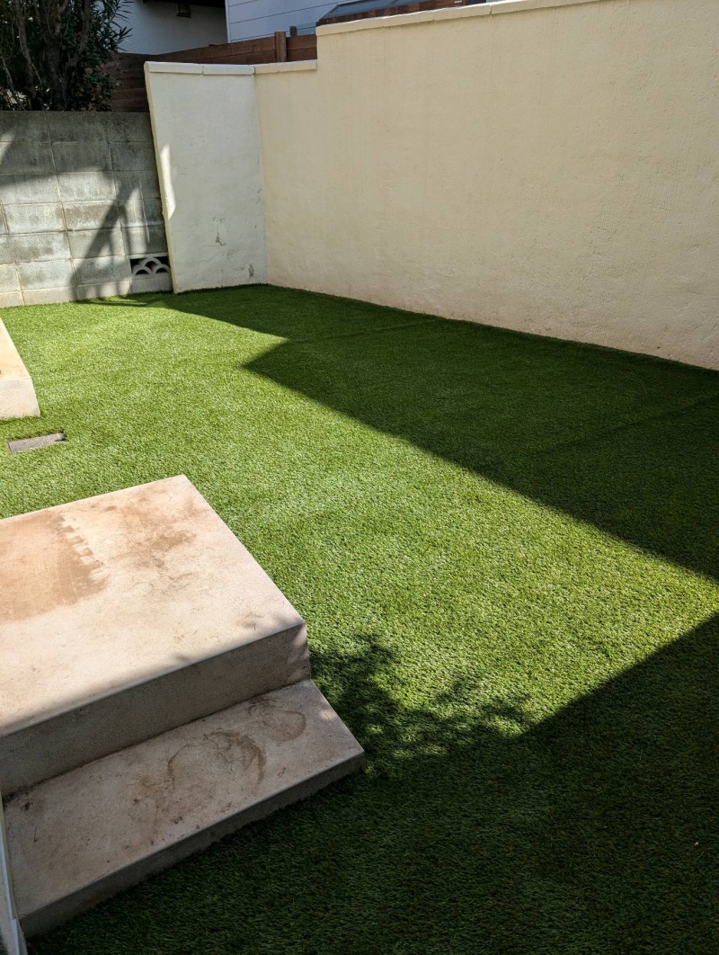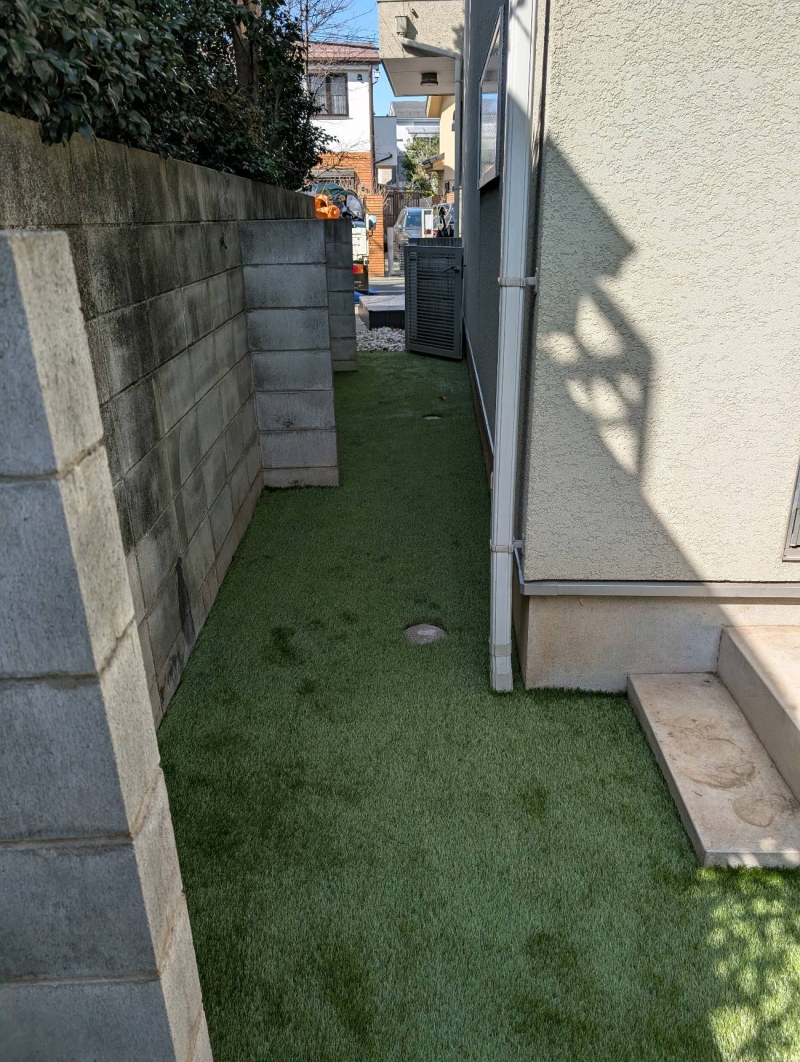 今回はお庭約30㎡の人工芝工事を行いました。 既存のお庭には不要物が多く残っていたため、 撤去・整理を行ったうえで施工しております。 脇道部分も含め、全体を一体感のある仕上がりに整えました。 また、見えない部分の排水マスにも備え、 事前準備を徹底したうえで施工を進めています。