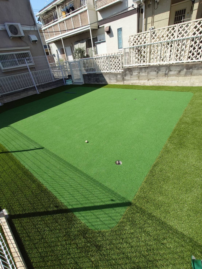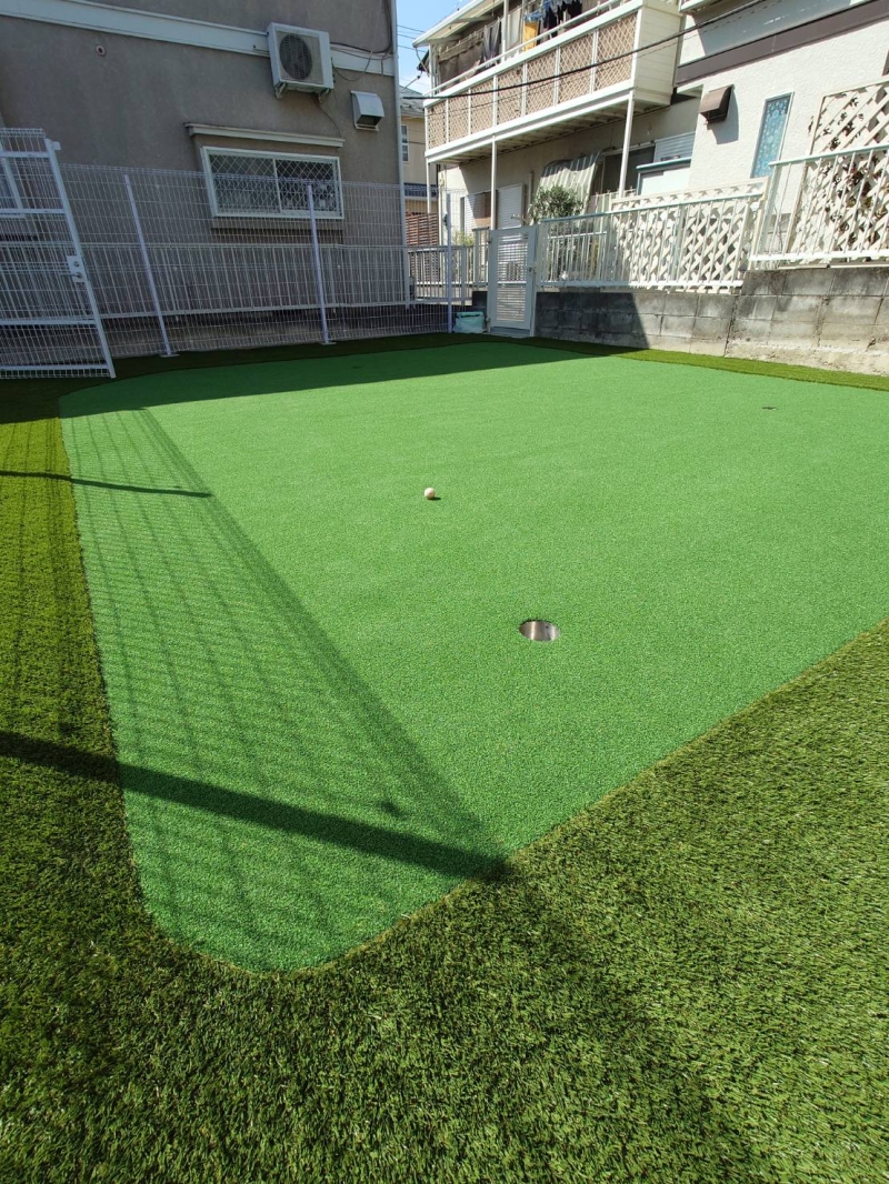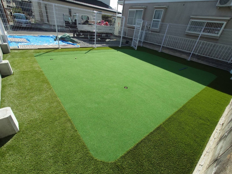 またパターグリーンは少しのオウトツで球ラインが変わってしまうため、通常の人工芝のように人工芝に釘を打つことができないため、特殊な工法となります。