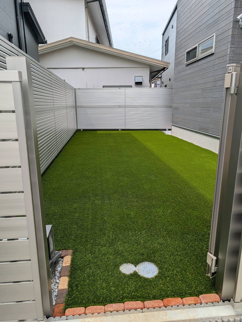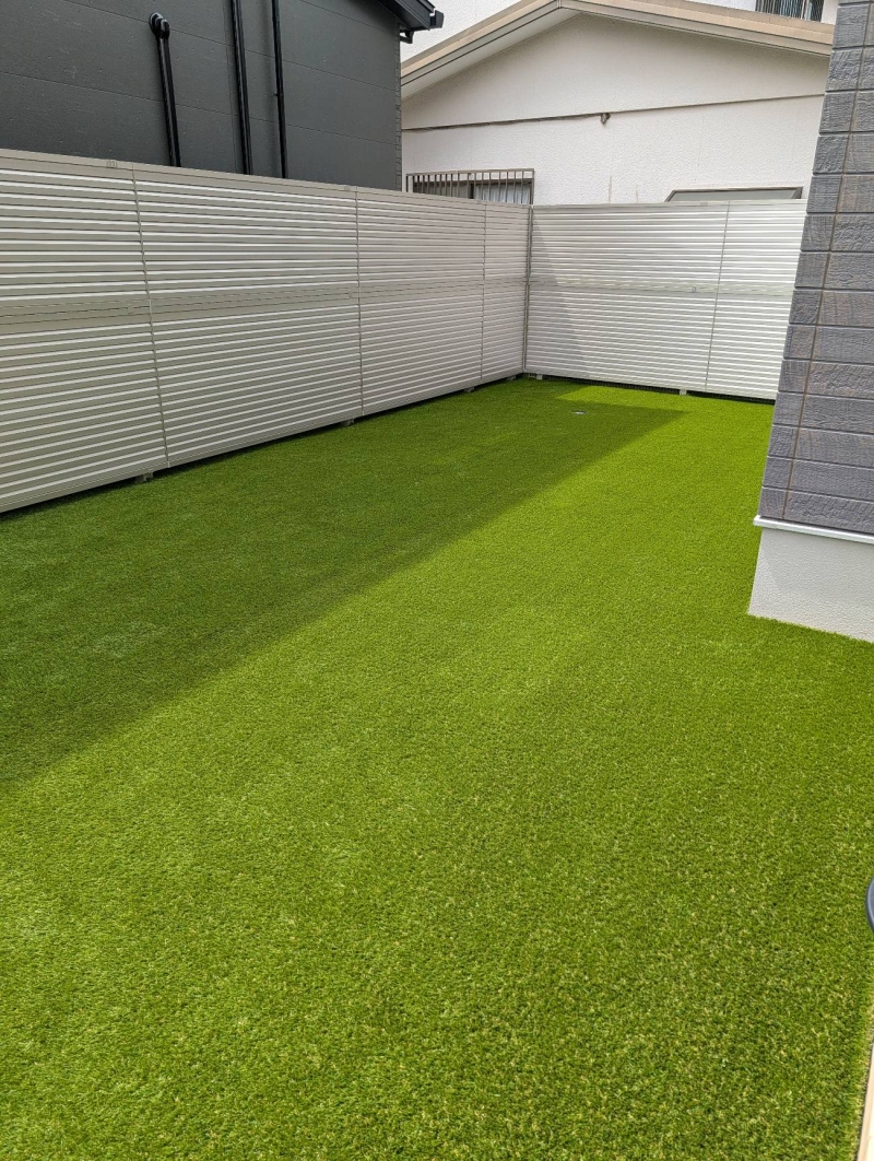 土のお庭から、30mm人工芝へリフォーム☆彡 今回は約38㎡の施工でした! ビフォーは土の状態で、 ・汚れやすい ・雑草の心配 ・使いにくさ が気になるお庭でしたが、、、 施工後は、見た目もスッキリ&使いやすいお庭に^^ さらに今回は ✔ マスが複数(計4ヶ所) ✔ 水栓・配管あり ✔ 今後フェンス設置予定 と、細かな調整が必要な現場。