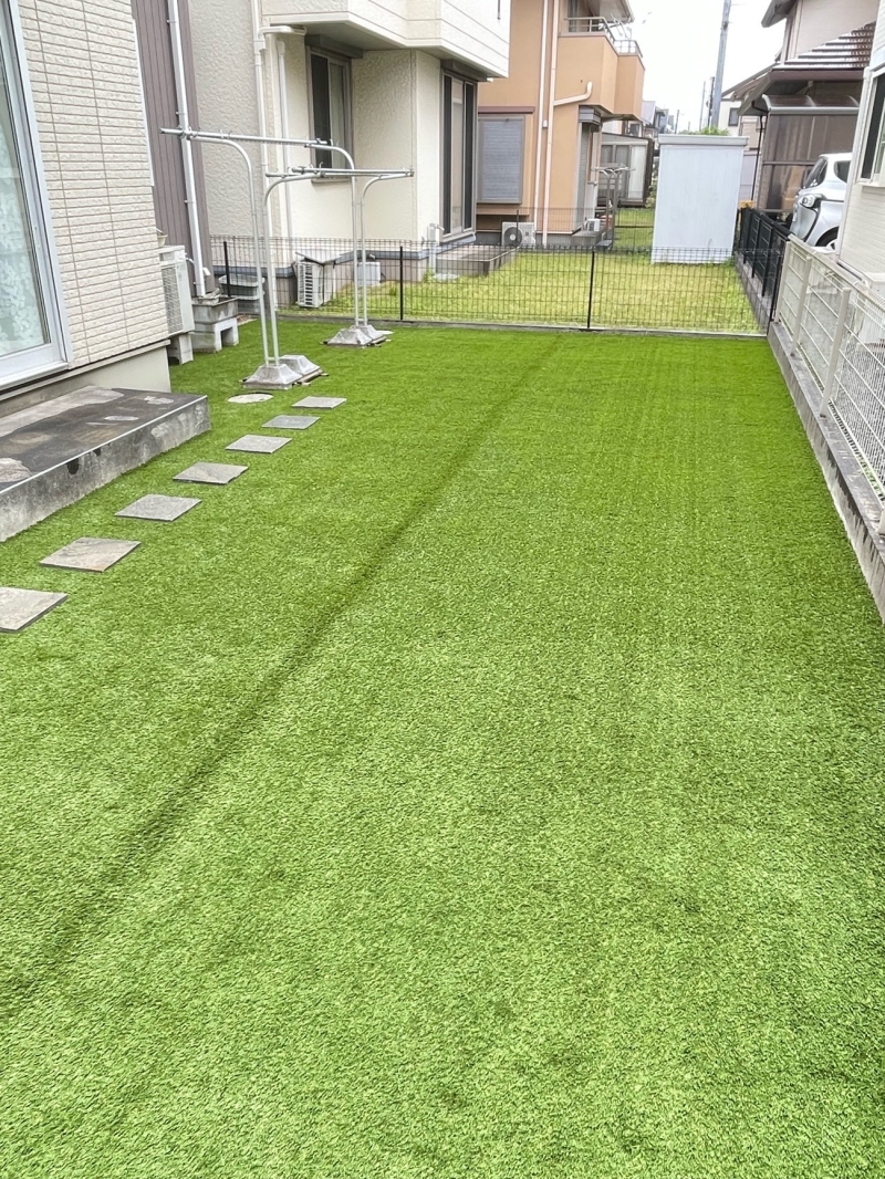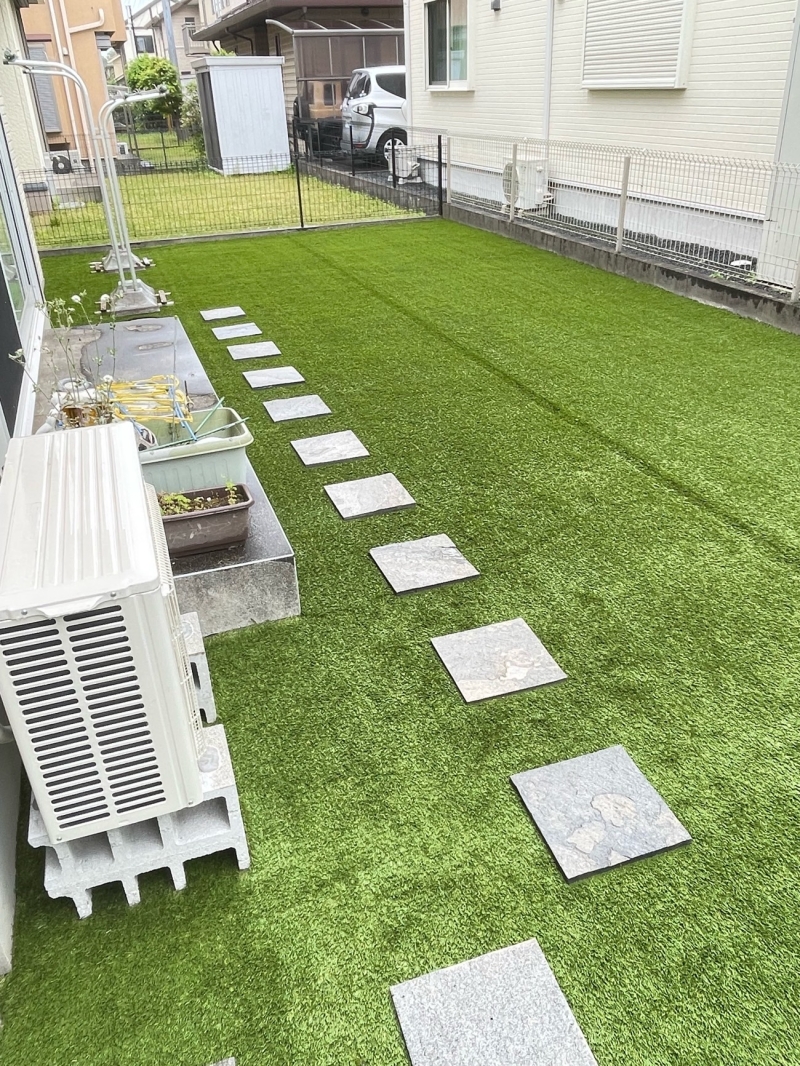 千葉県四街道市にて、天然芝のお庭を30mm人工芝へリフォームしました! 今回は約49㎡の広いお庭。 雑草や芝刈りの手間がかかりやすい天然芝部分を、1年中きれいに見える人工芝へ。 電柱まわりはあえて土を残し、円形の見切り材で自然に仕上げました。 さらに、お庭の右側から物干しまでの動線にはストーンタイルを設置。 見た目だけでなく、歩きやすさにも配慮したお庭になっています。